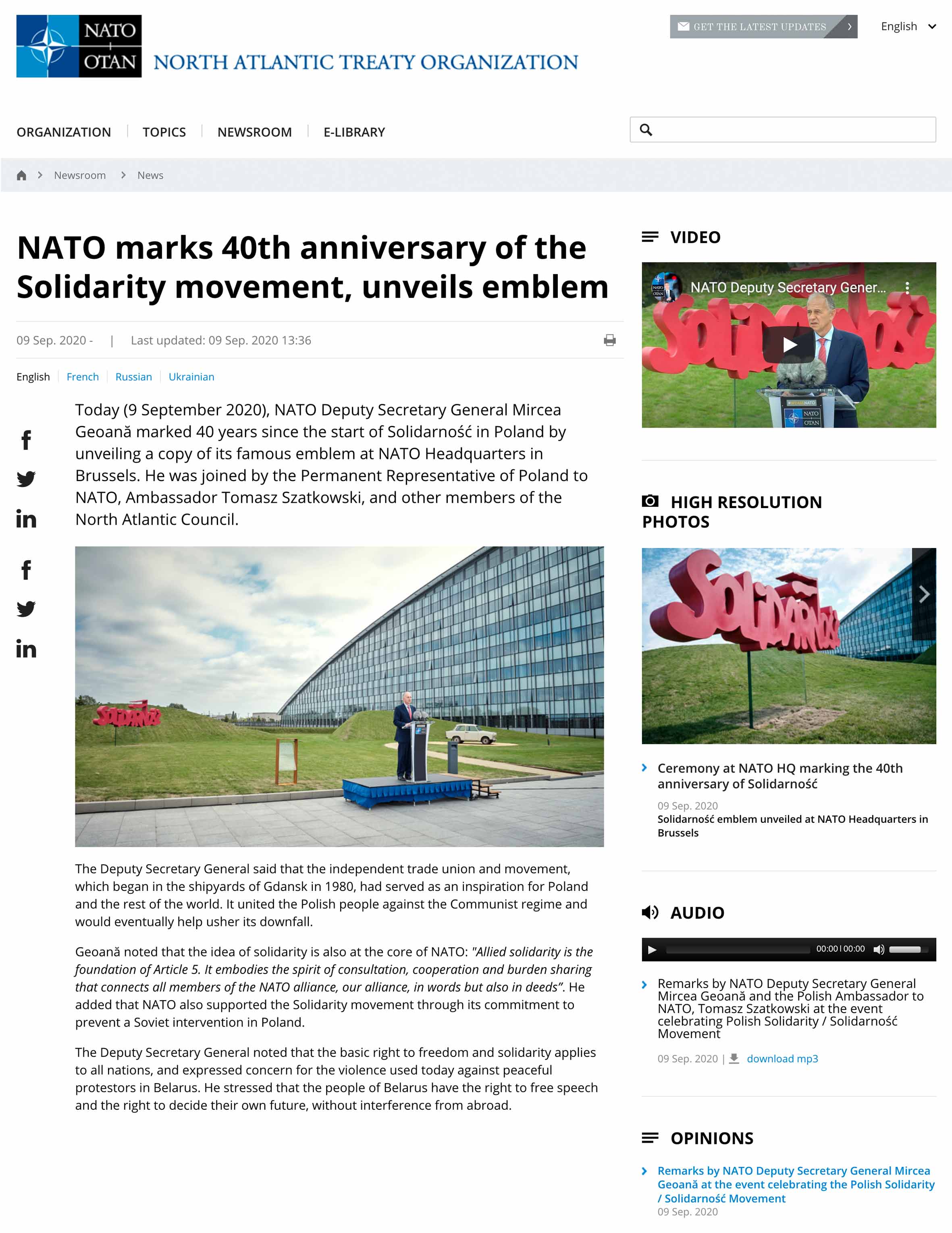 Ceremony marking the 40th anniversary of the Solidarność movement NATO / OTAN HQ Brussels 9 Sept 2020 More: Nato marks 40th anniversary of the Solidarity movenent